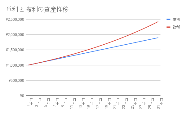 初めの10年ほどはその効果はわずかですが、15年を過ぎる頃から複利の方がグッと伸びてきています。ちなみに元本が2倍(200万円)になったのは、単利では34年目で、複利では24年目でした。