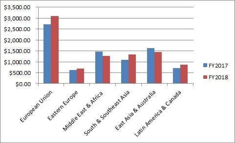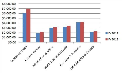 地域別の売上高では、前年同期比でEU諸国が14.9%増加、東欧が9.7%増加、東欧・アフリカが3.6%増加などとなり、全地域で増加となりました(グラフの単位は百万ドル)。