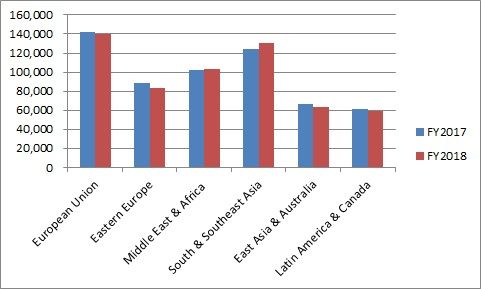 地域別の販売数の推移では、増加が中東・アフリカ(1.8%)、南・東南アジア(4.9%)となっており、減少しているのがEU諸国(1.9%)、東欧(6.5%)、東アジアと豪州(5.8%)、南米とカナダ(3.9%)となっています。全体では、1.2%の減少でした。