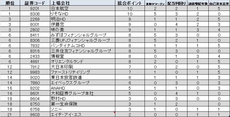1位は日本航空とりそなHDでした。日本航空は営業CFマージンが20%、配当利回りは2.7%、自己資本比率が56.6%で、総合10ポイントを獲得しました。2010年に会社更生法を適用した際に、負債が大幅に削減されたことで、現在の自己資本比率は高位となっています。就職人気ランキングでは同業のANAHDに後塵を拝していましたが、特殊事情があるとはいえ、投資の魅力度ではライバルを上回りました。