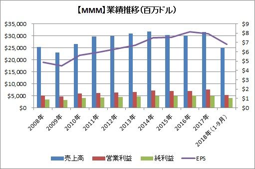 株価もすばらしいですね。一時的な下落はあるものの、確実に上昇しており、綺麗なチャートです。現在は米中貿易戦景気後退懸念から相場全体が下げているので、3M株も売られています。