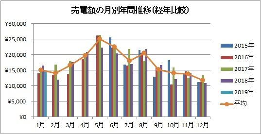 下の2つの棒グラフは、「2019年推移(売電金額・買電金額)」と「売電額の月別年間推移(経年比較)」です。晴天が続いたために発電量が増えて、売電金額は増加しました。また暖房使用機会が増えて買電金額は大幅に増加しました。