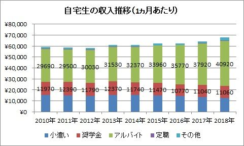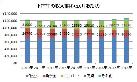 2018年の自宅生のアルバイト収入は40,920円で7年連続の増加となり、直近8年間で初めて4万円台になりました。下宿生のアルバイト収入は31,670円で3年連続の増加となり、こちらも初めて3万円台に乗せました。