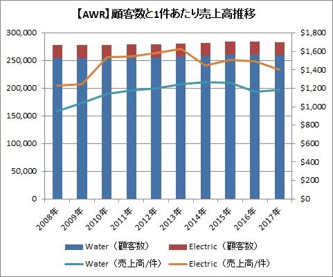 顧客数推移は安定的に推移しています。水道事業は26万件、電気事業が2.4万件の顧客を抱えています。事業別の顧客1件あたりの売上高は、水道事業が1,100ドル前後、電気事業が1,500ドル前後で推移しています。