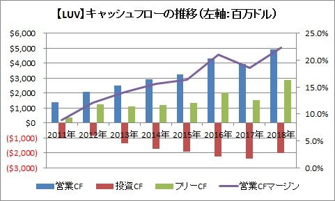 航空会社にしては珍しく安定したキャッシュフローですね。普通は投資CFがドカーンと増加して、フリーCFがマイナスに陥る年が何度かあるものです。新規で機材を調達しないと行けませんからね。もちろんサウスウェスト航空も新規に調達しているのでしょうが、しっかりコントロールされている印象がありますね。やはり737型機に特化しているのが良いのでしょう。