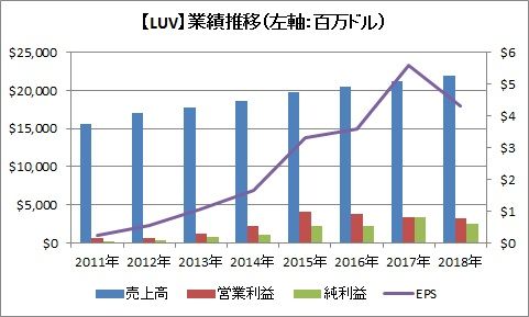 バークシャーはすでにサウスウエスト航空の第2位株主で、保有比率は9.9%となっています。「未確認」とはいえ、買収の憶測が流れたということは、それなりに同社ビジネスに期待を寄せているからでしょう。過去の業績などを調べてみました。