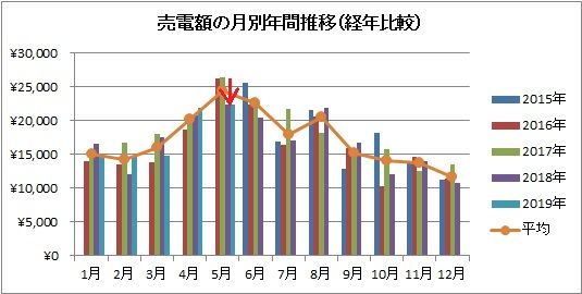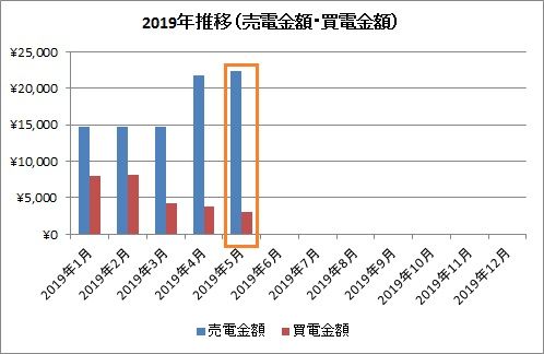 売電金額は前月比555円(3%)増加しました。前年同月比では74円(0%)の微増となりました。2019年5月分は過去4年分の平均額を下回りました。GW期間中(特に4月末)は曇りの日が多かったように記憶しています。それが影響しましたね。