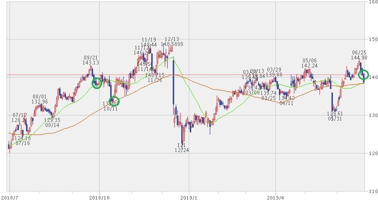 下の株価チャートでは、時短父さんがJNJを買い付けた時期を○で示しています。
