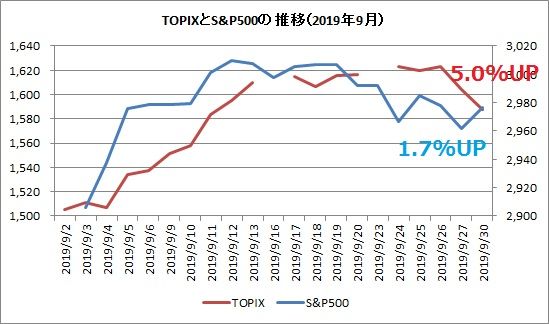 9月末をゼロとする10月の株価の騰落率を上に示しました。10月はTOPIXが5.0%上昇したのに対して、S&P500指数は2.0%の上昇に留まりました。9月もTOPIXは5%上昇、S&P500は1.7%上昇でした。2ヵ月連続で日本株がアウトパフォームしています。