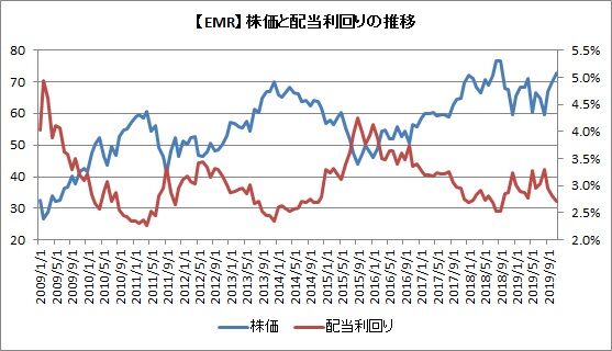 最後にエマソン・エレクトリックの株価と配当利回りの推移です。