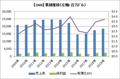 ではエマソン・エレクトリックの過去の業績を振り返ってみたいと思います。同社は9月が決算期になっているので、2019年の年間決算も含んでいます。