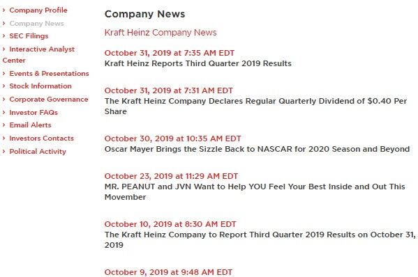 クラフト・ハインツのIRサイト内のCompany NewsやSEC Filingsを振り返ると、過去1年間では平均して2日~3日置きに更新されていました。最長でも13日間でした。