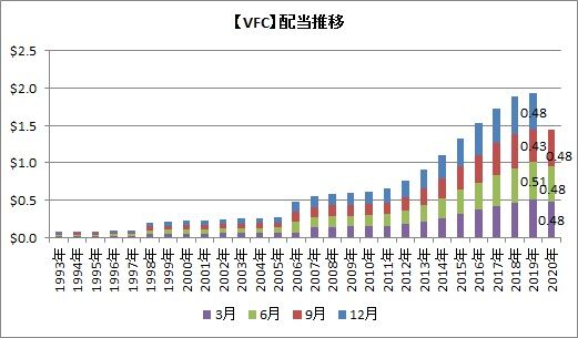 VFコーポレーションはこれまで47年間連続増配を続けてきました。しかし、2019年9月支払分で0.51ドル→0.43ドルの減配を実施(翌期すぐに増配)したことで、この連続増配に黄色信号がともっています。12月支払分まで0.48ドルのままだと、連続増配は止まります。