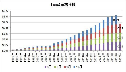 ベクトン・ディッキンソンの権利落ち日は9月8日、配当支払日は9月30日、四半期配当は0.79ドル、現在の年間配当利回りは1.34%となっています。