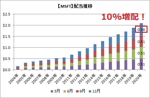 マイクロソフトの良いところは、ハイテク・成長株でありながら、しっかり配当という形で株主還元もしてくれているところですね。ハイテク株もいつかは(IBMのように)、成長は止まります。そんな時に配当があれば、株主にとって安心です。