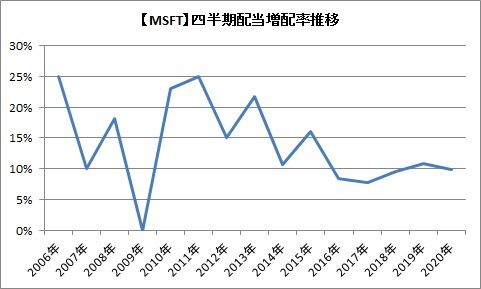 でも10%というはマイクロソフトからすれば、普通なのです。過去の四半期配当の増配率は以下の通りです。過去には25%(06年・11年)もありました。