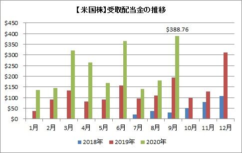 9月も配当が入りました。保有する米国株(ETF含む)17銘柄のうち、10銘柄からです。そしてその総額は、388.76ドルでした。