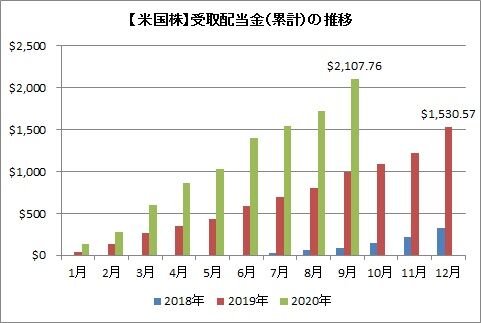 これで2020年に受け取った累積配当額は約2107ドルとなり、ついに2000ドルを突破しました。最初の1000ドルに5ヵ月(1-5月)かかり、次の1000ドルは4ヵ月(6-9月)でした。ということは、12月までに3000ドル突破も見えてきましたね。