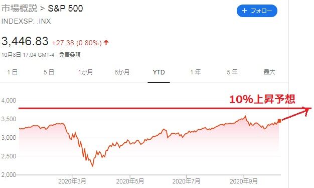 10/8現在の株価は3446.83ポイント。3800というのは、現時点より10%余り上昇することを意味します。