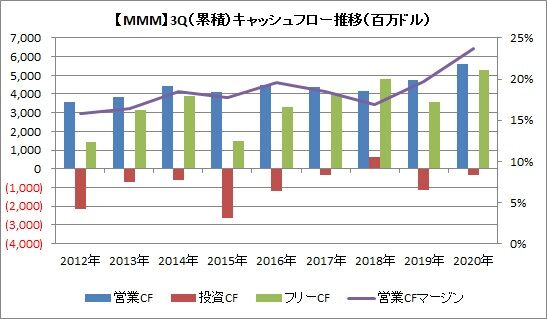 よってフリーキャッシュフローは52.7億ドルと、2012年以降では最も多くキャッシュを稼ぎ出しました。気になるのは配当支払余力ですね。3Mはこの9ヵ月間で25.4億ドルの配当を支払いましたので、キャッシュフローベースの配当性向は48.1%(=25.4億ドルドル÷52.7億ドル)となりました。