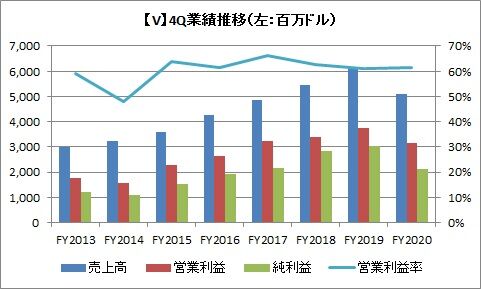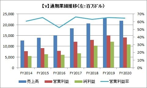 売上高は218億ドル(前年比4.9%減)、営業利益は140億ドル(同6.1%減)、純利益は108億ドル(同10%減)、希薄化一株利益は4.89ドル(同8.1%減)でした。会計年度が10~9月となっており、新型コロナの影響が業績に出始めたのが、第3四半期以降だったから、減収・減益幅が小さくて済んでいます。