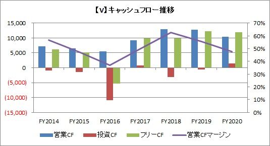 キャッシュフローはどうだったかというと、こちらはやや悪化しました。営業CFは104億ドルで前年比18%減でした。投資CFは14億ドルの収入でプラスとなり、フリーCFは118億ドル(同2.7%減)でした。営業CFマージンは48%で、前年の56%からは悪化しました。