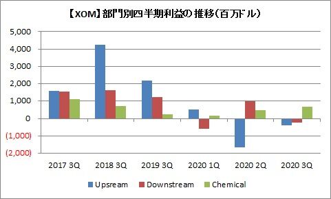 純損失は6.8億ドルでした。希薄化後の一株あたり損失も0.15ドルでした。これによりエクソン・モービルは初めて3四半期連続の赤字となります。しかし、市場予想は0.25ドルの損失でしたから、それほどに損失は膨らみませんでした。