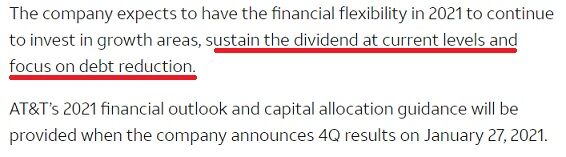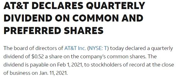 「AT&Tの取締役会は本日、当社の普通株式において、一株あたり0.52ドルの四半期配当を宣言しました。支払日は2021年2月1日、2011年1月11日までに保有している株主に支払われます」と書いてあります。