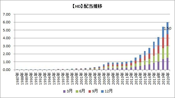 ホーム・デポの四半期配当は1.50ドルとなっていて、年間配当利回りは2.2%です。5年前は0.59ドルでしたので、154%増となっています。この期間の平均増配率は20.5%と驚異的な数字です。