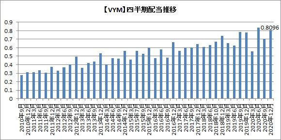 今回、VYMは四半期配当を0.8096ドルと設定しました。こちらは前回0.7053ドルから14.8%の増配となっています。ただし前回9月の時は15%を超える減配となっていたので、それを相殺した形です。