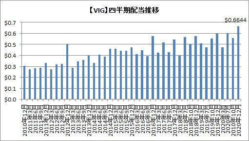 VYMもVIGも四半期毎で見ると凸凹(増配と減配を繰り返している)がありますが、増配傾向が続いていることはパッと見で分かりますね。