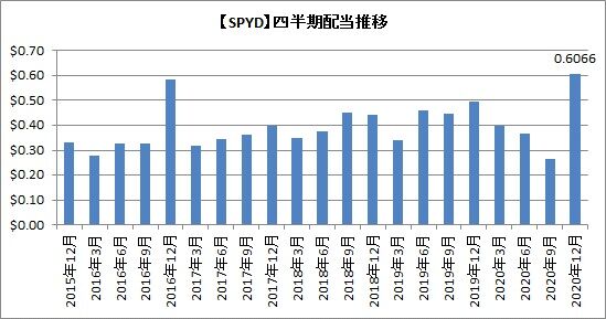 で、SPDRのサイトからは四半期配当の情報が取れないのですが、ブルームバーグの株価情報サイトから直近の配当額が掲載されていました。これによると、12月四半期配当はなんと0.9868ドル!これは前回9月の0.6858ドルから43.9%も増えたことになります。ちょっと信じられないですけどね、、、。特別配でも加算されているんじゃないかと思います。