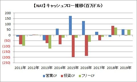 まずフリーキャッシュフローが少なすぎるし、ここ数年間フリーキャッシュフローはマイナス続きでした。そもそも営業キャッシュフローがプラスになることが多くないし、非常にバラつきがあります。せっかく営業キャッシュフローが大きくプラスになっても、投資(船を買う)が大き過ぎるのです。