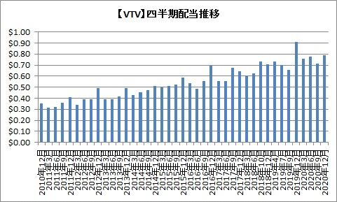 VTVは第4四半期配当を0.7892ドルとしました。これは前回比10.3%増配、前年同期比13.2%減配という奇妙な配当の出し方となっています。ただし年間配当では3.0395ドルで、1.3%増配となりました。平均増配率は9%なので、これもパフォーマンスが落ちました。