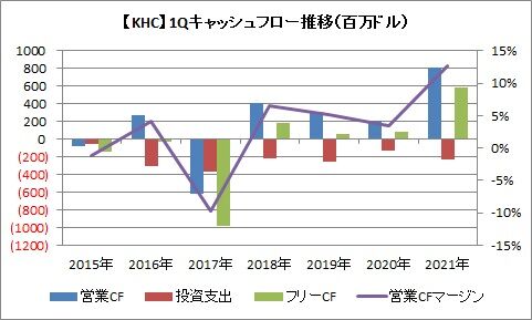 営業キャッシュフローマージンは一年前の3%台から、なんと13%台にまで急上昇しました。売上高がしっかりとキャッシュ創出に繋がってきているようです。2020年通期では19%まで上昇したので、この1-3月での13%はある意味で当然の結果とも言えますが、あの稼げない時代を知っているだけに、よくここまで立て直してくれたなと、本当に嬉しいです。