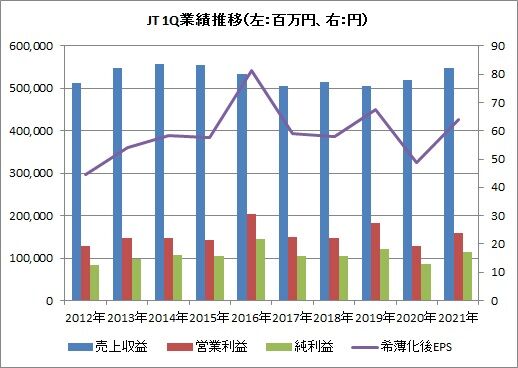 日本たばこ産業(JT)が2021年1-3月期の決算を発表しました。内容は良かったです。