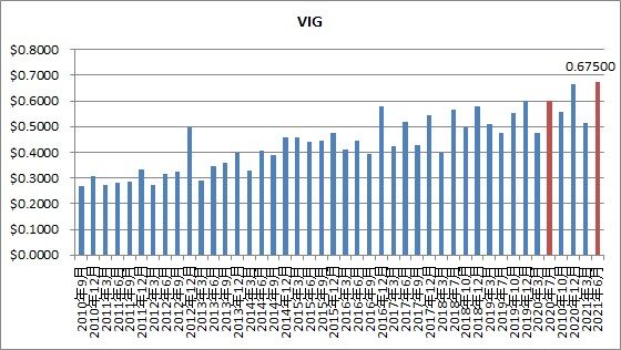 まずはVIGから。バンガード社が発表したところによると、一株あたり配当は0.67500ドルです。これは3月配当比で31.6%増、前年同月比では12.4%増となっています。