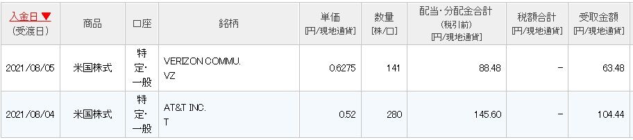 米通信大手のAT&T(T)とベライゾン・コミュニケーションズ(VZ)から8月支払の四半期配当を受け取りました。受取額は税引き後で167.92ドルでした。