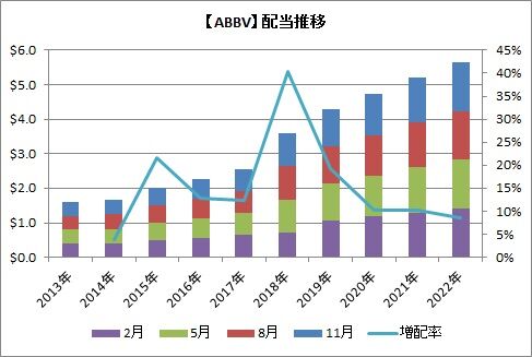 2021年の年間配当は5.20ドル(四半期は1.30ドル)でしたから、その8.5%増ということは、2022年年間配当は5.64ドルとなります。つまり、2月からの四半期配当は1.41ドルです。