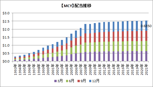 MCYは自動車保険の引き受け会社です。MCYは11月2日に、12月30日支払の四半期配当を0.6325ドルから0.6350ドルへと、0.4%の増配を発表しました。目を疑いますね。0.4%なんてほぼ変わっていないじゃん。2020年からほとんど増えていませんが、一応これでも配当貴族銘柄ですからね、、、。