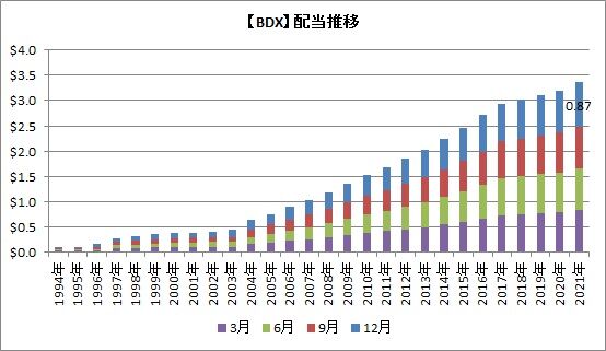 2017~2019年の増配率は2%台と低迷していましたが、2020年は5%台となっており、増配ペースを上げ直してきているようです。BDXは25年以上連続増配銘柄に与えられる称号、配当貴族銘柄の一つです。