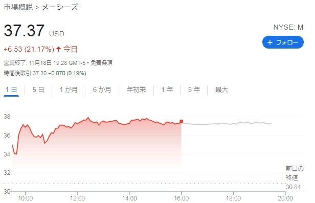 18日、百貨店大手のメーシーズ(M)の株価が爆上げしました。