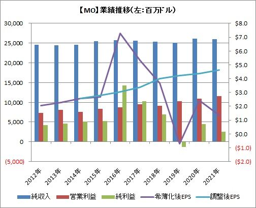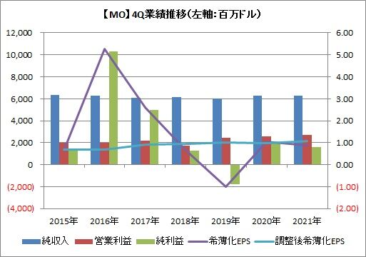 ここ(MO)は純利益の変動が激しいんですよ。投資によって事業を取得したり、それを手放したりした効果が出やすいので。2016年は営業利益60億ドルちょっとに対して、純利益が100億ドルを超えました(笑)