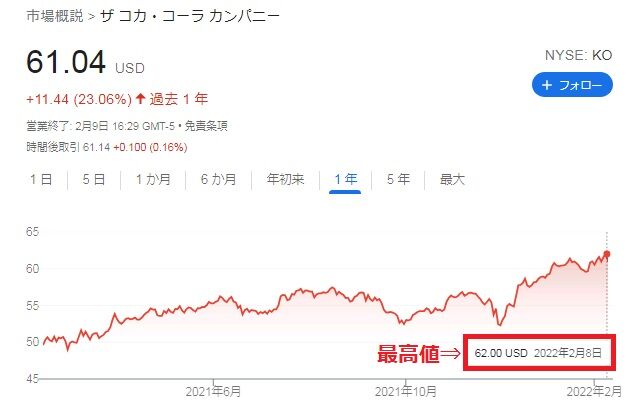KOの3.8%高は大したことないかもしれませんが、前日(現地8日)までは株価が62.00ドルを付けて最高値を更新していました。
