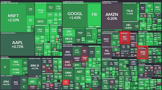 KO(1.77%安)とXOM(1.39%安)です。