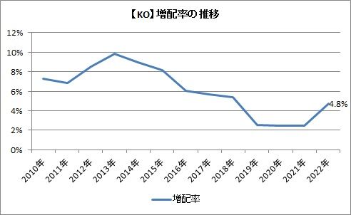というのも、直近3年間は1セントずつの増加、増配率は2%台の半ばに留まっていたからです。