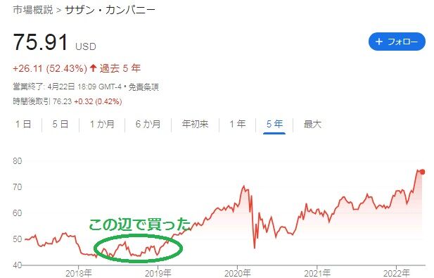 平均取得価格は44.58ドル、現在株価75.91ドル。きっと緑線で囲った辺りで買ったんだと思います。