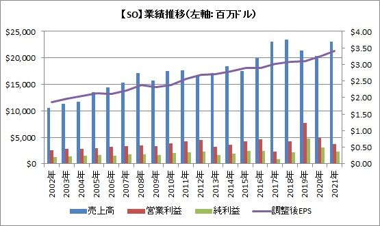 サザンの業績を振り返ってみましたが、まずまず順調にトップラインもボトムラインもを伸ばしています。2021年は調整後一株利益が過去最高でした。