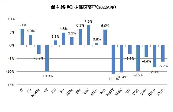 最大の下げはマイクロソフト(MSFT)の11.1%安。あとアッヴィ(ABBV)の10.4%安、ベライゾン(VZ)の10.0%安です。