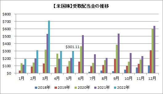 合計で301.11ドルです。301.11ドルは、前年同月比で45.7%増です。本来4月配当のアルトリアからの118ドルが、5月に入金されたのが要素としては大きいですね。